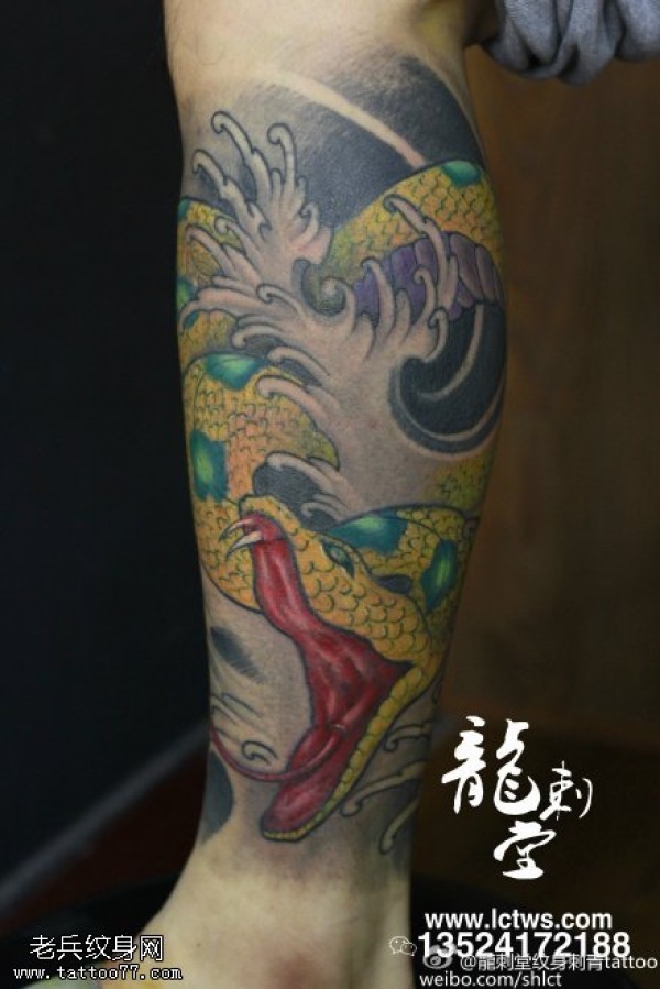 小腿上的黄金蛇纹身图案