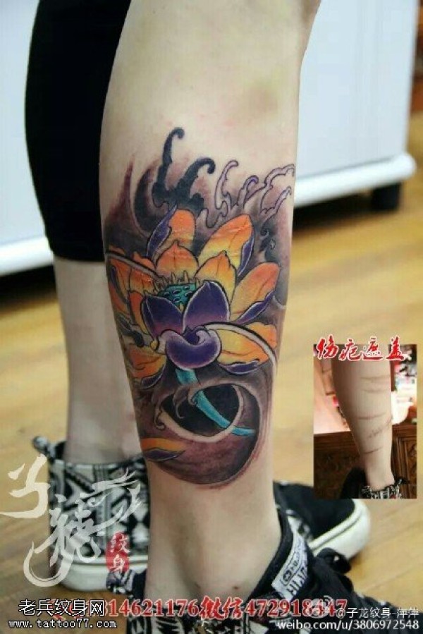小腿上逼真经典的莲花纹身图案