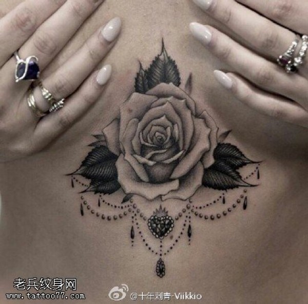 巨乳美女胸口上的性感玫瑰纹身图案