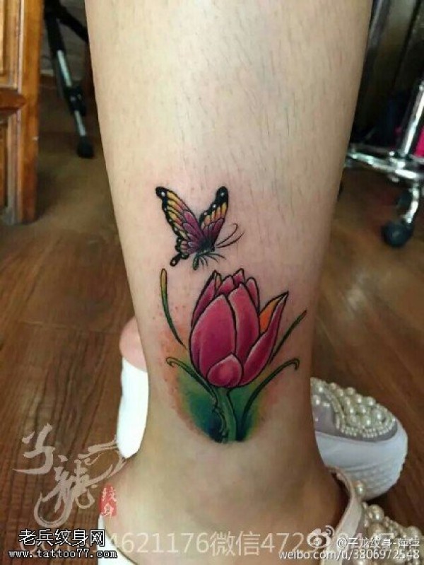 脚腕上漂亮的郁金香蝴蝶纹身图案