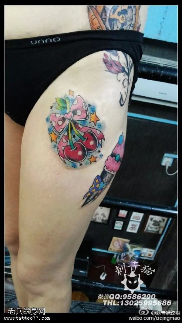 彩绘大樱桃蝴蝶结纹身图案