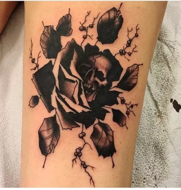黑灰色玫瑰花和骷髅头纹身图片手稿