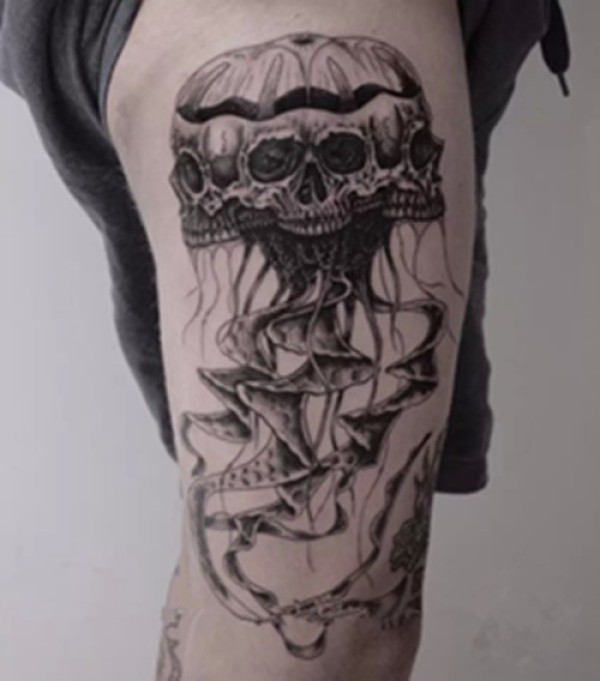 超帅时尚的黑灰骷髅与蛇纹身图案