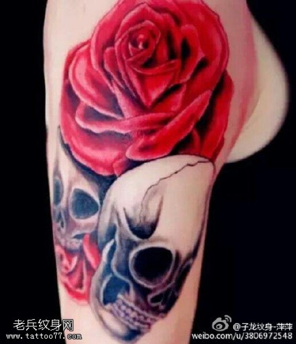 女生手臂经典潮流的骷髅与玫瑰花纹身图案