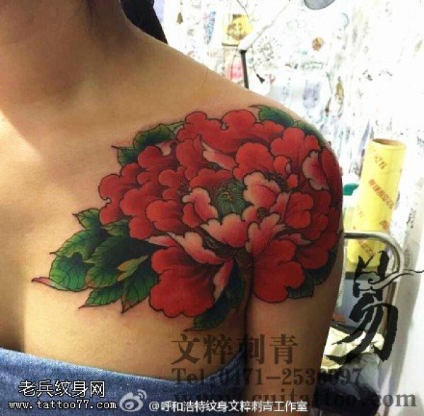 女生肩花纹身_15张女性双肩对称的肩花纹身图案作品图片