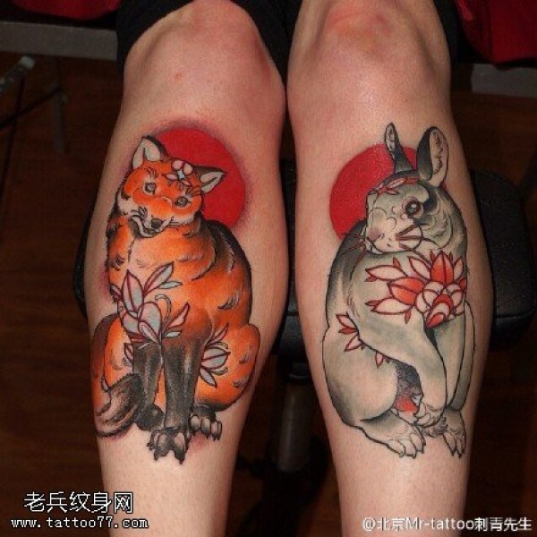 彩绘狐狸和兔子纹身图案