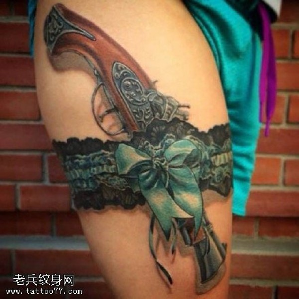 大腿上蝴蝶结手枪纹身图案