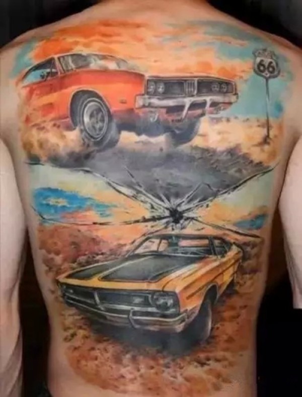 丰乳肥臀的性感美女和绿色老爷车纹身