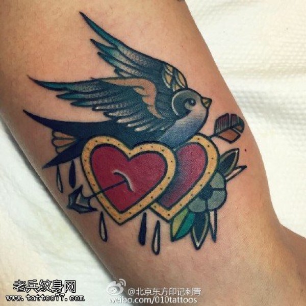 彩绘鸟儿一箭穿心纹身图案