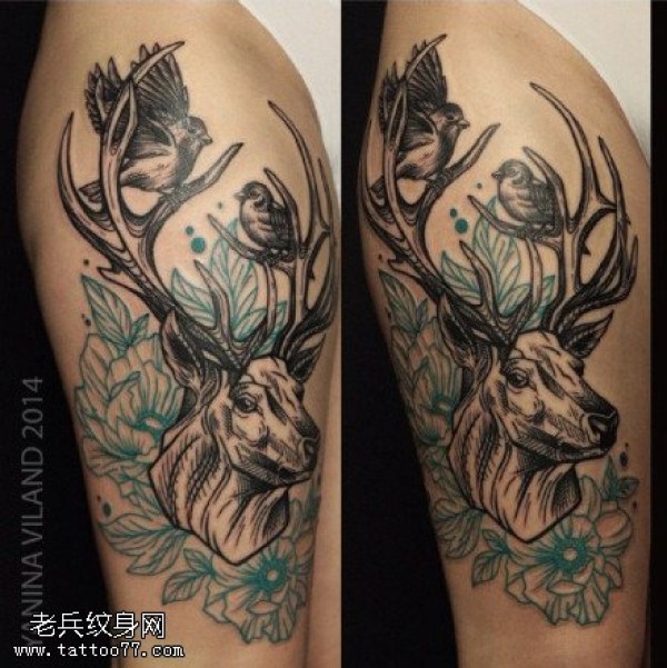 肩部鹿角花卉纹身图案