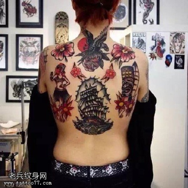 背部花卉老鹰帆船纹身图案