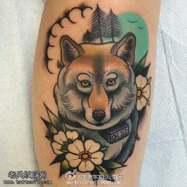 彩绘狼狗花卉纹身图案