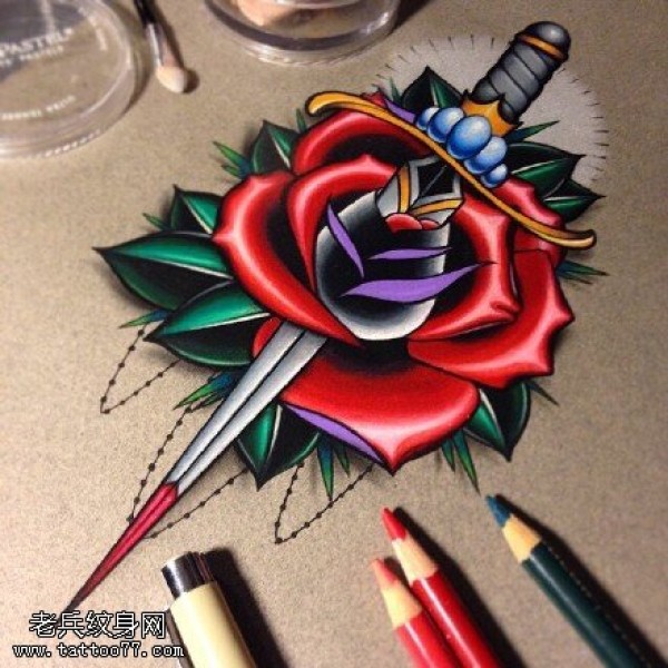 彩绘玫瑰匕首纹身图案