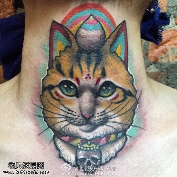 脖子上彩绘的猫咪纹身图案