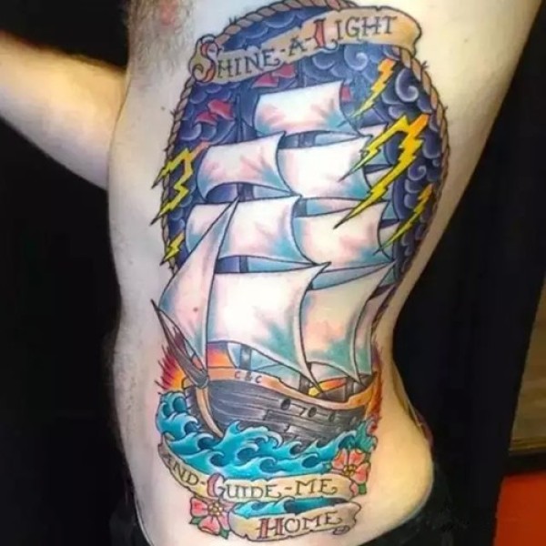 侧腰唯美帆船纹身