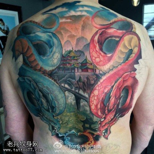 背部青蛇红蛇纹身图案