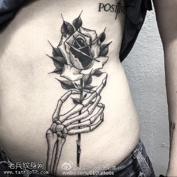 腹部手骨玫瑰纹身图案
