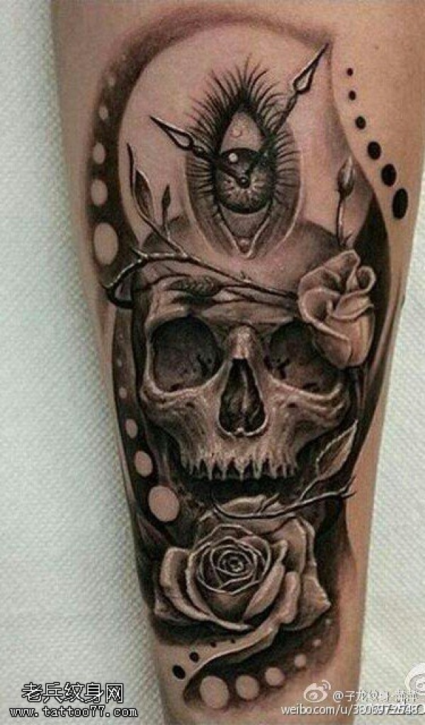 腿上的时光眼骷髅玫瑰纹身图案