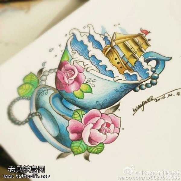 彩绘花瓶里的帆船纹身图案