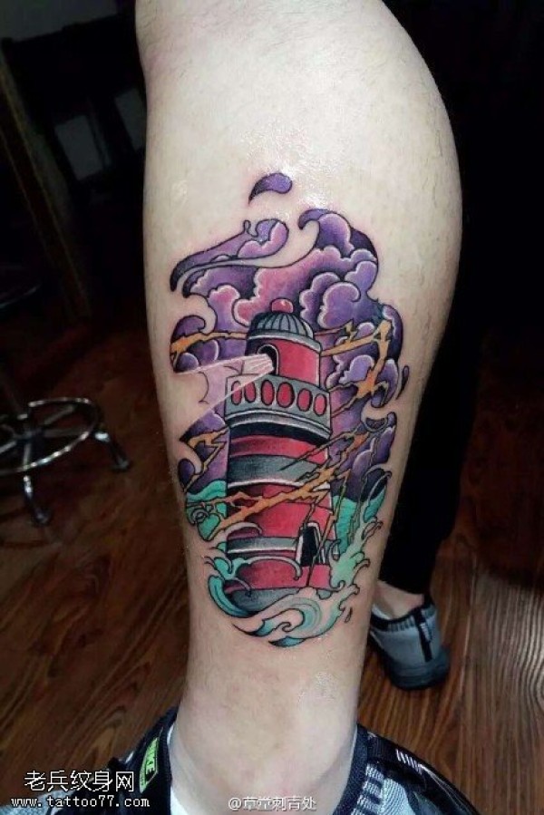 小腿上彩色的灯塔纹身图案