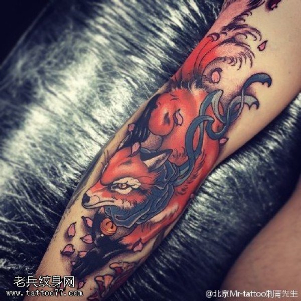 腿上的花狐狸纹身图案