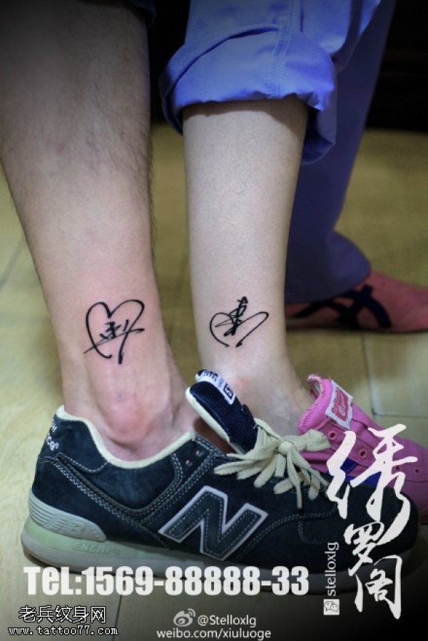 情侣脚腕上的心字符纹身图案