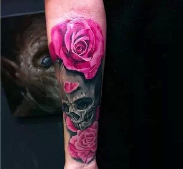 女生手臂经典潮流的骷髅与玫瑰花纹身图案