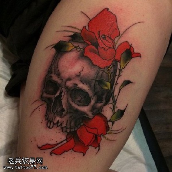 女生手臂经典潮流的骷髅与玫瑰花纹身图案