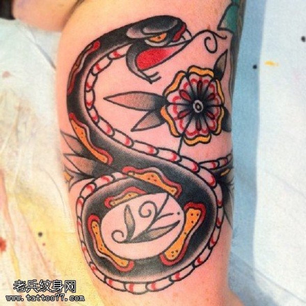 腿部蛇戏花纹身图案