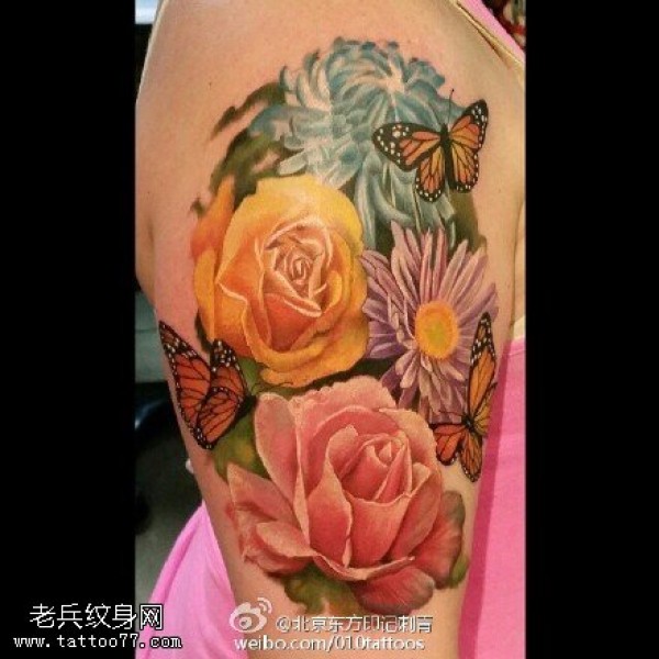 女生肩花纹身_15张女性双肩对称的肩花纹身图案作品图片