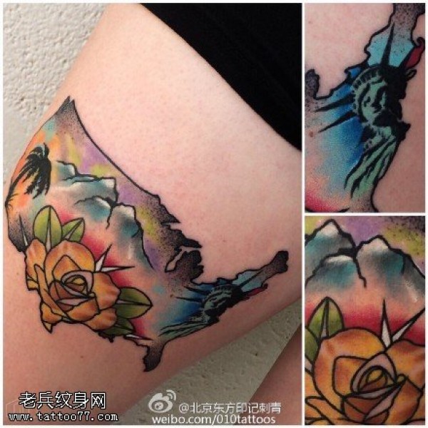 大腿上的风景花卉纹身图案