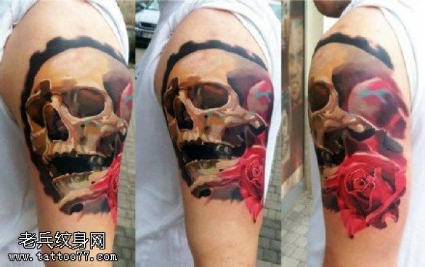 女生手臂经典潮流的骷髅与玫瑰花纹身图案