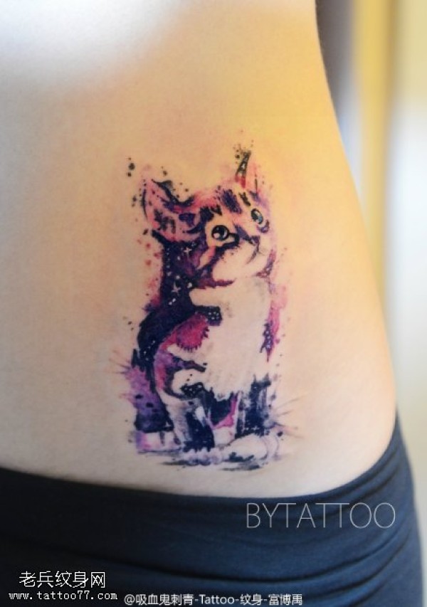 腰部水彩的猫咪纹身图案