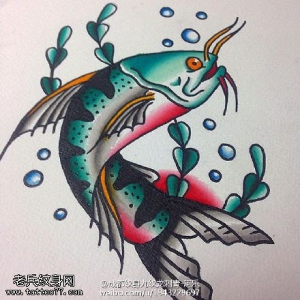 手稿彩绘鲶鱼纹身图案