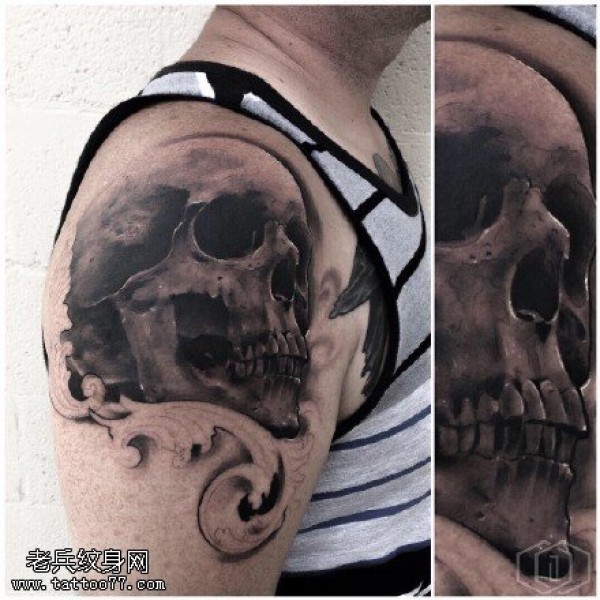 肩膀逼真的骷髅纹身图案