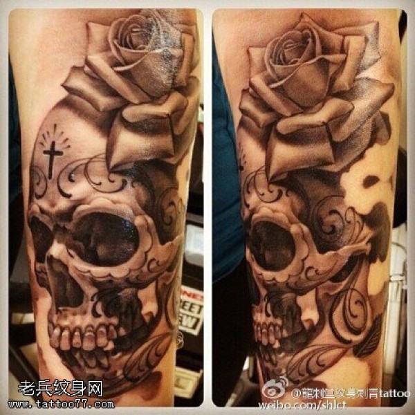手臂经典骷髅玫瑰纹身图案