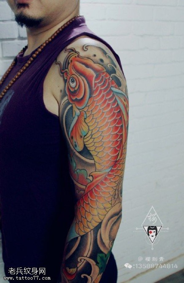 肩膀红色大锦鲤纹身图案