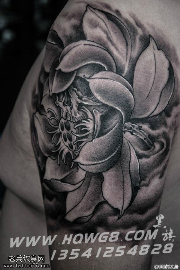 肩部水墨莲花纹身图案