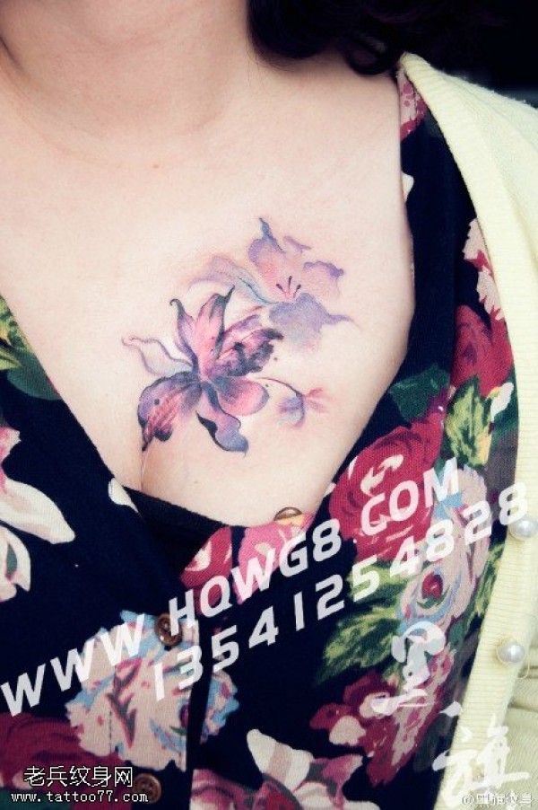 胸前水彩的花卉纹身图案