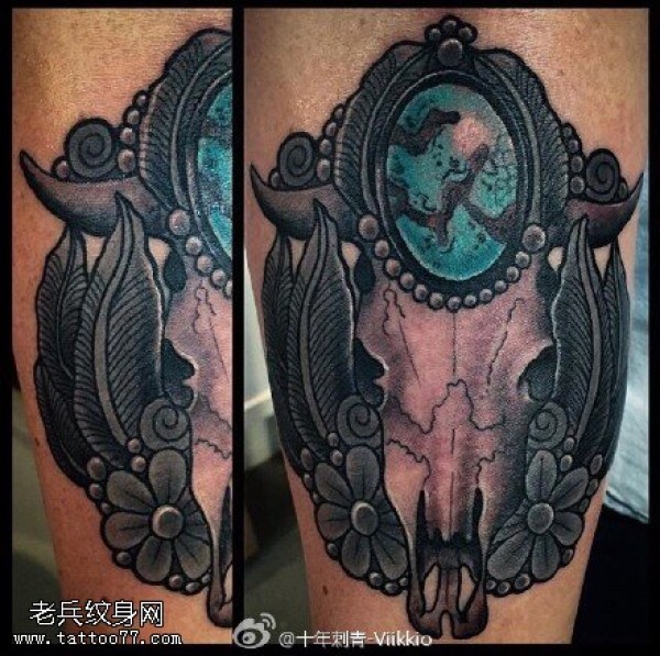 小腿上的骷髅宝石纹身图案