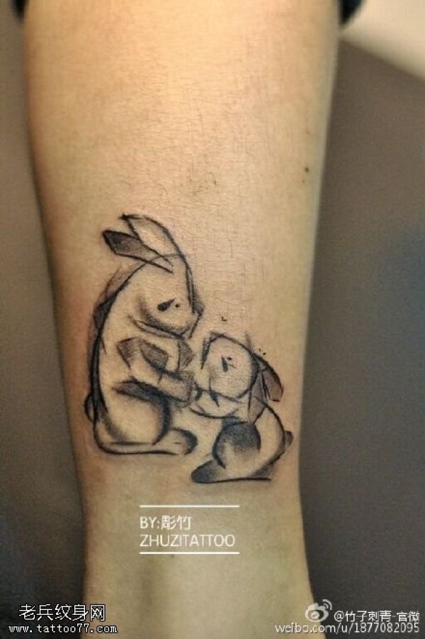 小腿上的兔妈妈和宝宝纹身图案