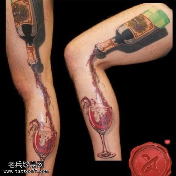 腿部的红酒纹身图案