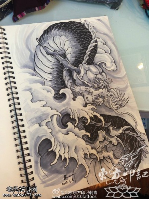 龙纹身手稿_一组老传统黑灰龙手稿纹身图案
