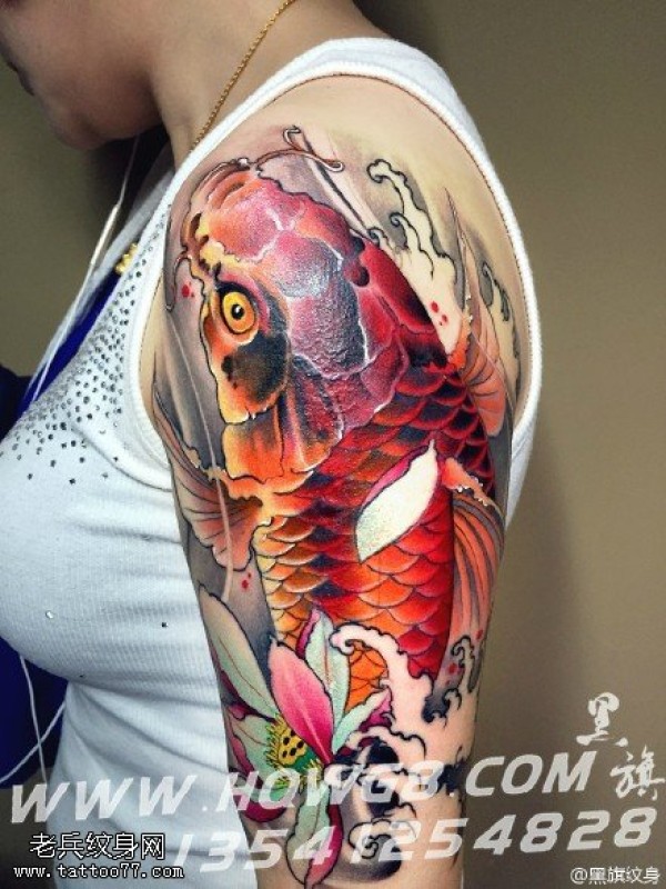 肩部红色锦鲤纹身图案