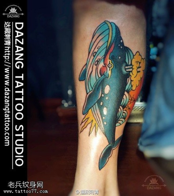 小腿彩绘的鲸鱼纹身图案