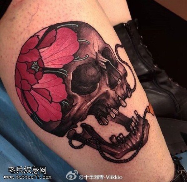 大腿的牡丹骷髅纹身图案