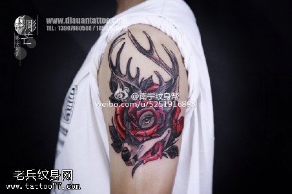 肩膀玫瑰鹿纹身图案