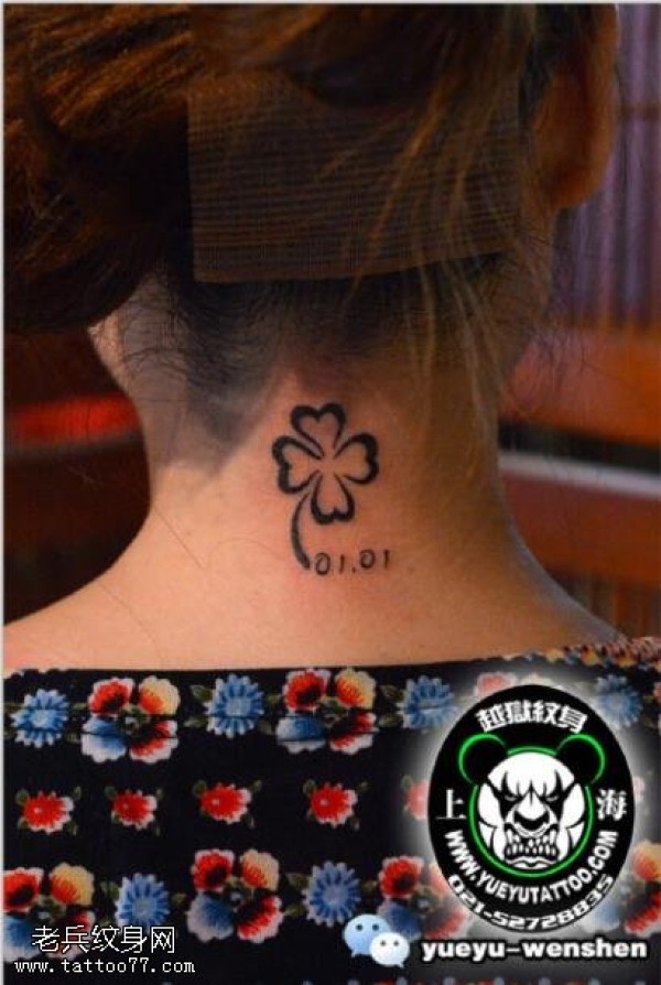 脖子点刺四叶草纹身图案