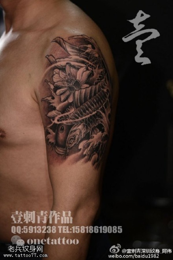 肩部锦鲤荷花纹身图案