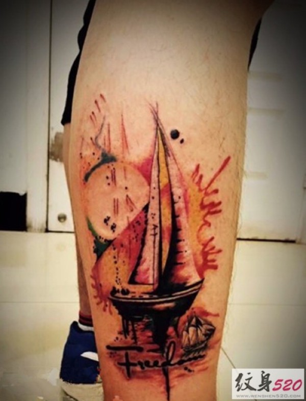小腿部好看的帆船纹身